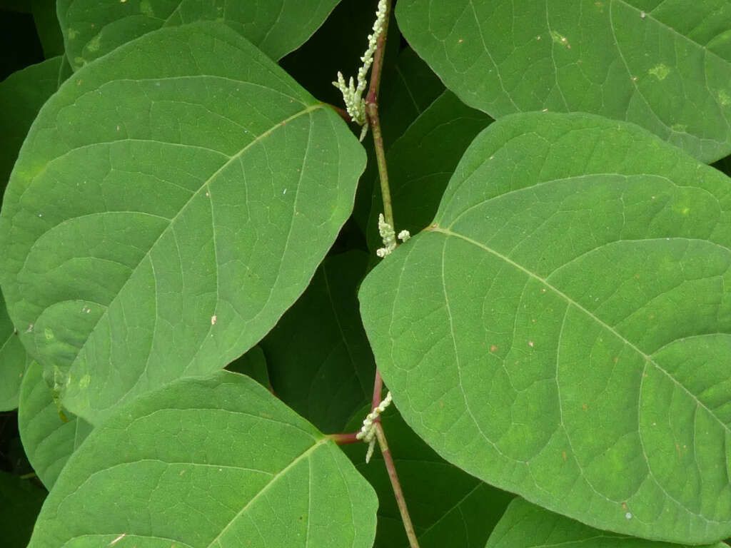 Japanese knotweed is a tall perennial with bamboo-like hollow stems, heart- or shovel-shaped leaves, and small white flowers that bloom in late summer. It can be identified by its zigzag stem pattern and rapid growth, reaching up to 3 meters in height. Other variants include Giant knotweed (Fallopia sachalinensis), which is taller with larger leaves, and Bohemian knotweed , a hybrid of the two with intermediate traits. These species differ in leaf shape, stem thickness, and habitat preference but all share aggressive growth and deep rhizome systems.
